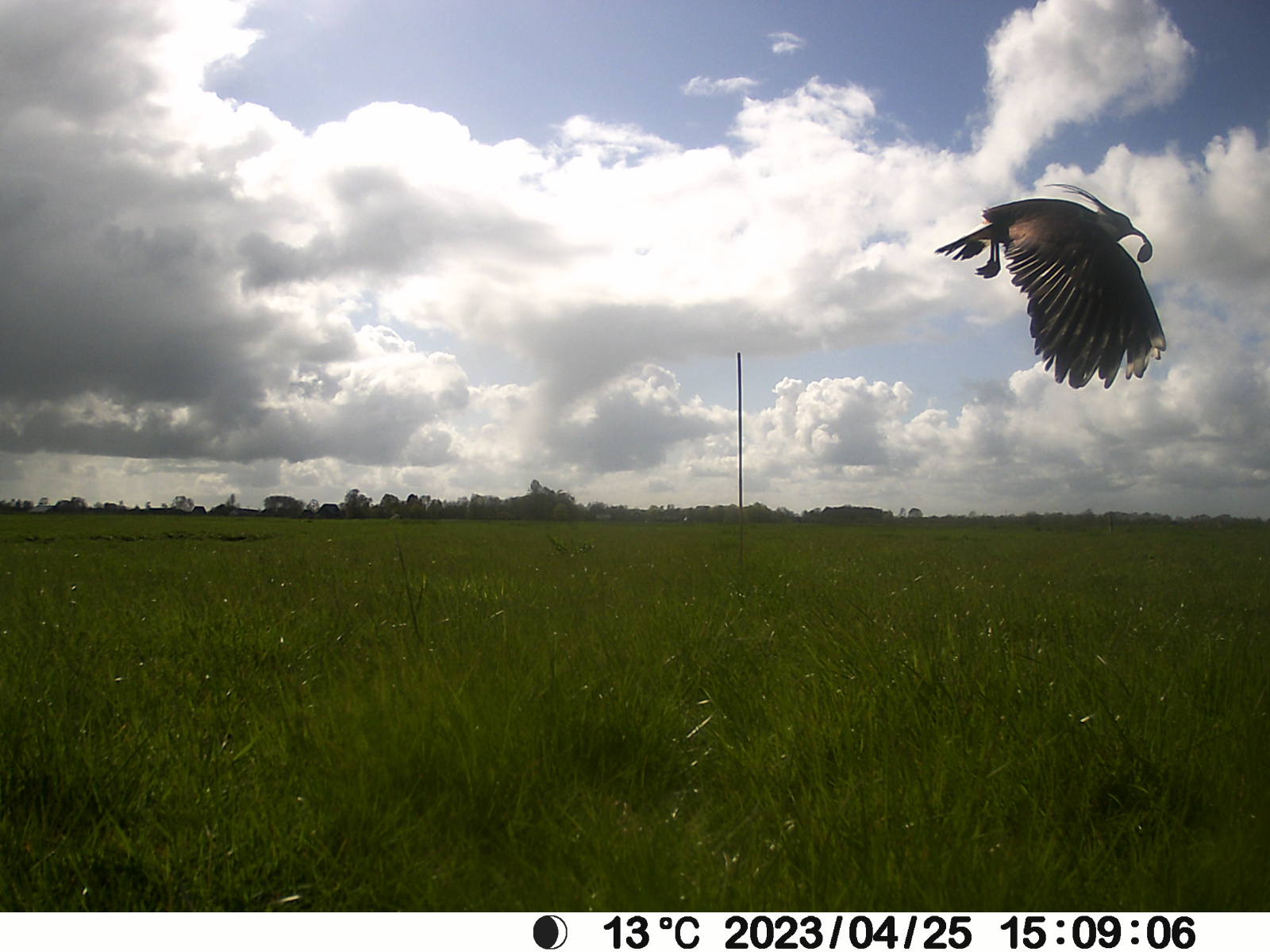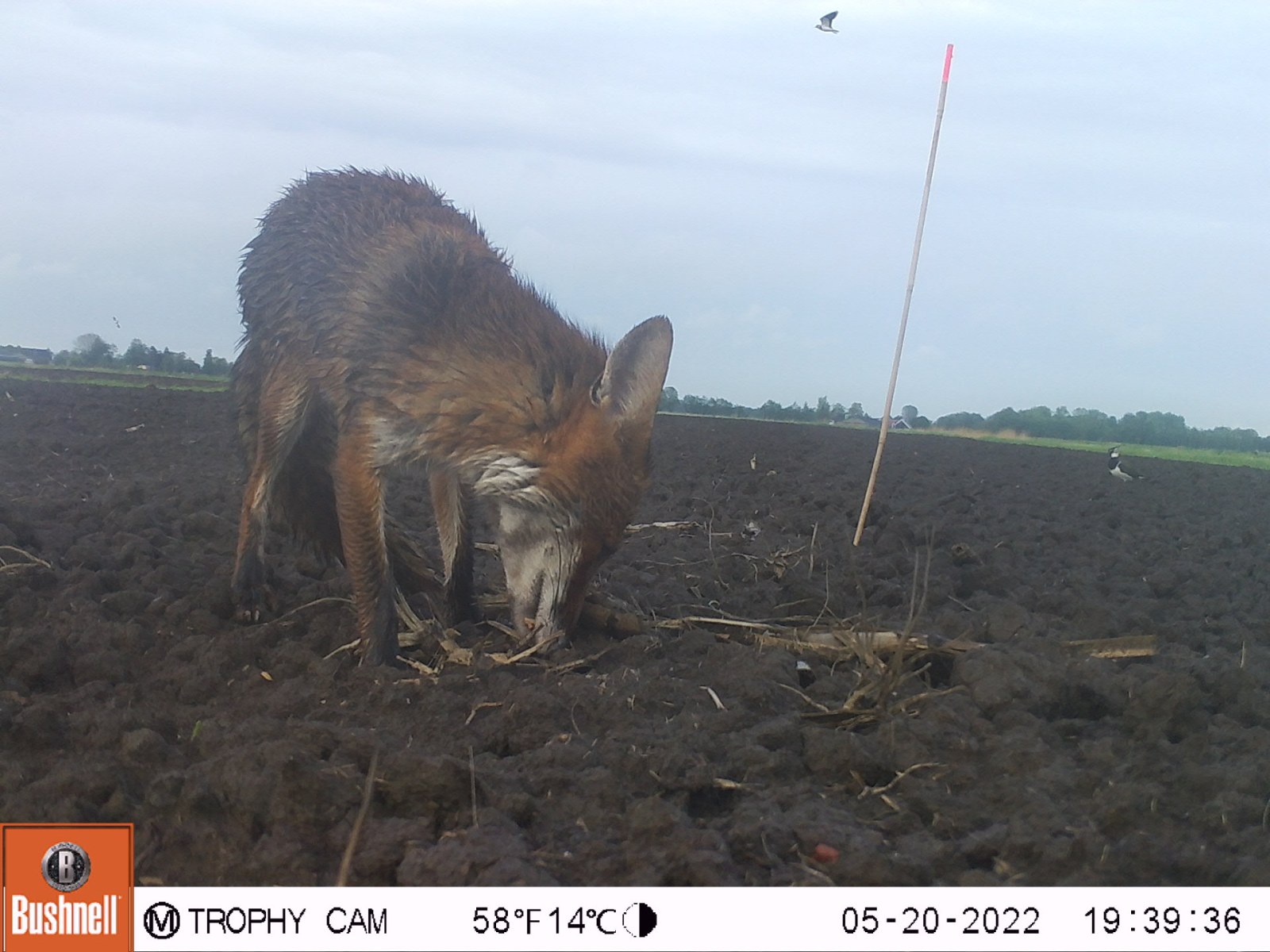 Arjan vertelt over de verschillende wildcamera’s die hij in het land heeft staan. ‘Je haalt er ontzettend veel informatie uit’. Kijkend naar de beelden ziet hij broedende kieviten en kievitskuikens. Maar aan de andere kant ook de predatoren. Vorig jaar hadden we ontzettend veel last van predatie. Als we dan ontdekken dat een nest leeg is, kijken we de camerabeelden terug om te bekijken wat de oorzaak is. De vos hebben we meerdere keren duidelijk op beeld gekregen. Daarna zie je zelfs dat de kievit de lege eierdoppen zelf opruimt.